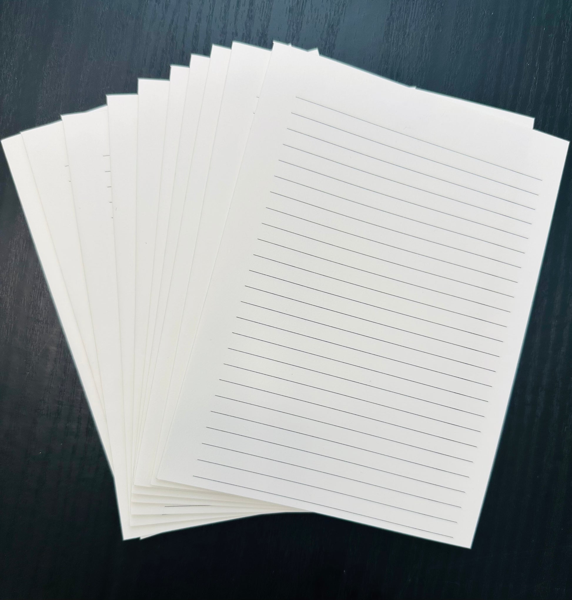 This set features 10 folded and pressed signatures - 4/pages per signature- 40 sheets total. The paper is 70 lb. Mohawk via, text weight. Signatures were mis-cut at bottom margin. Approximately 5” x 7”, black lined, middle margin.