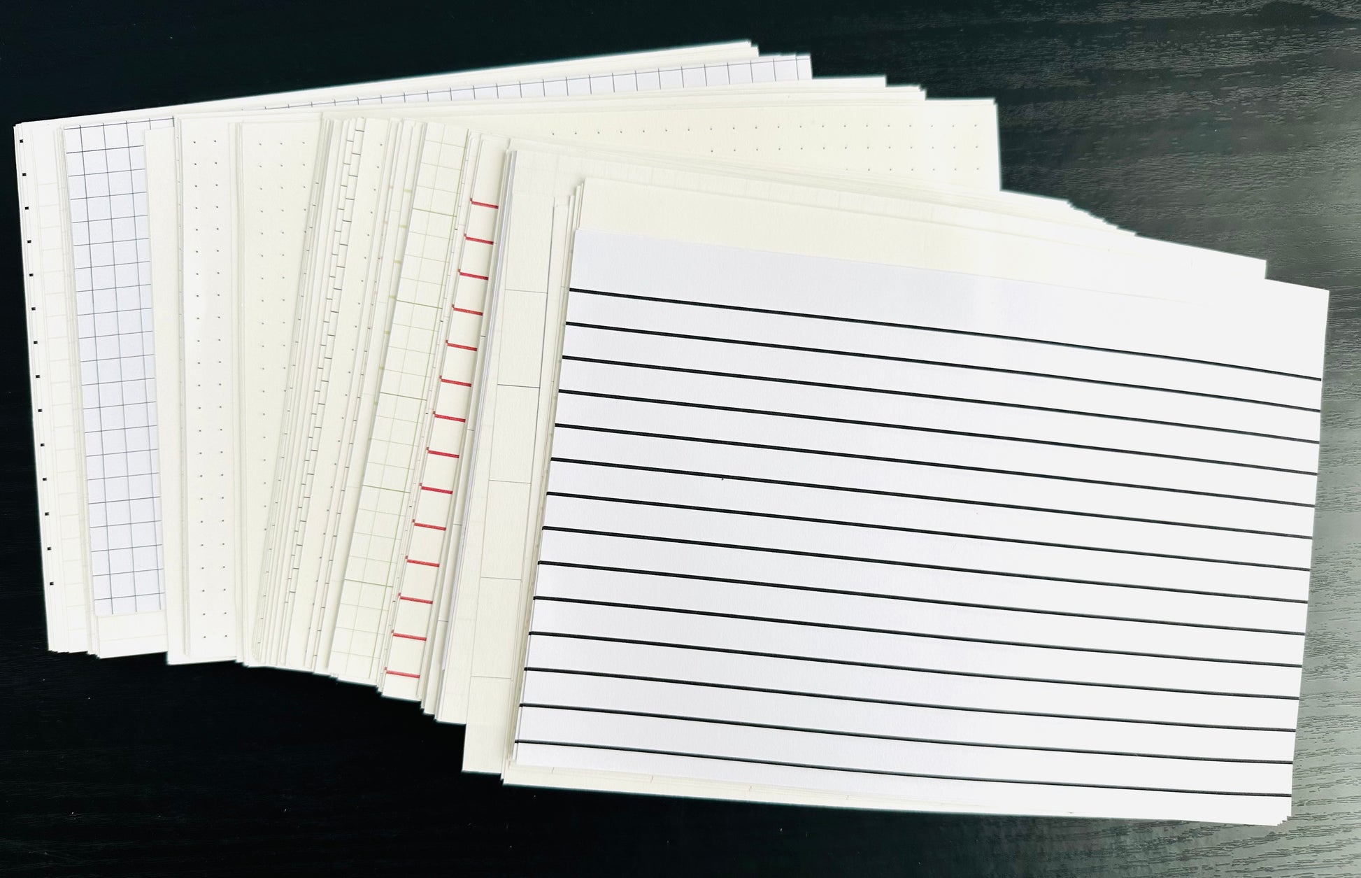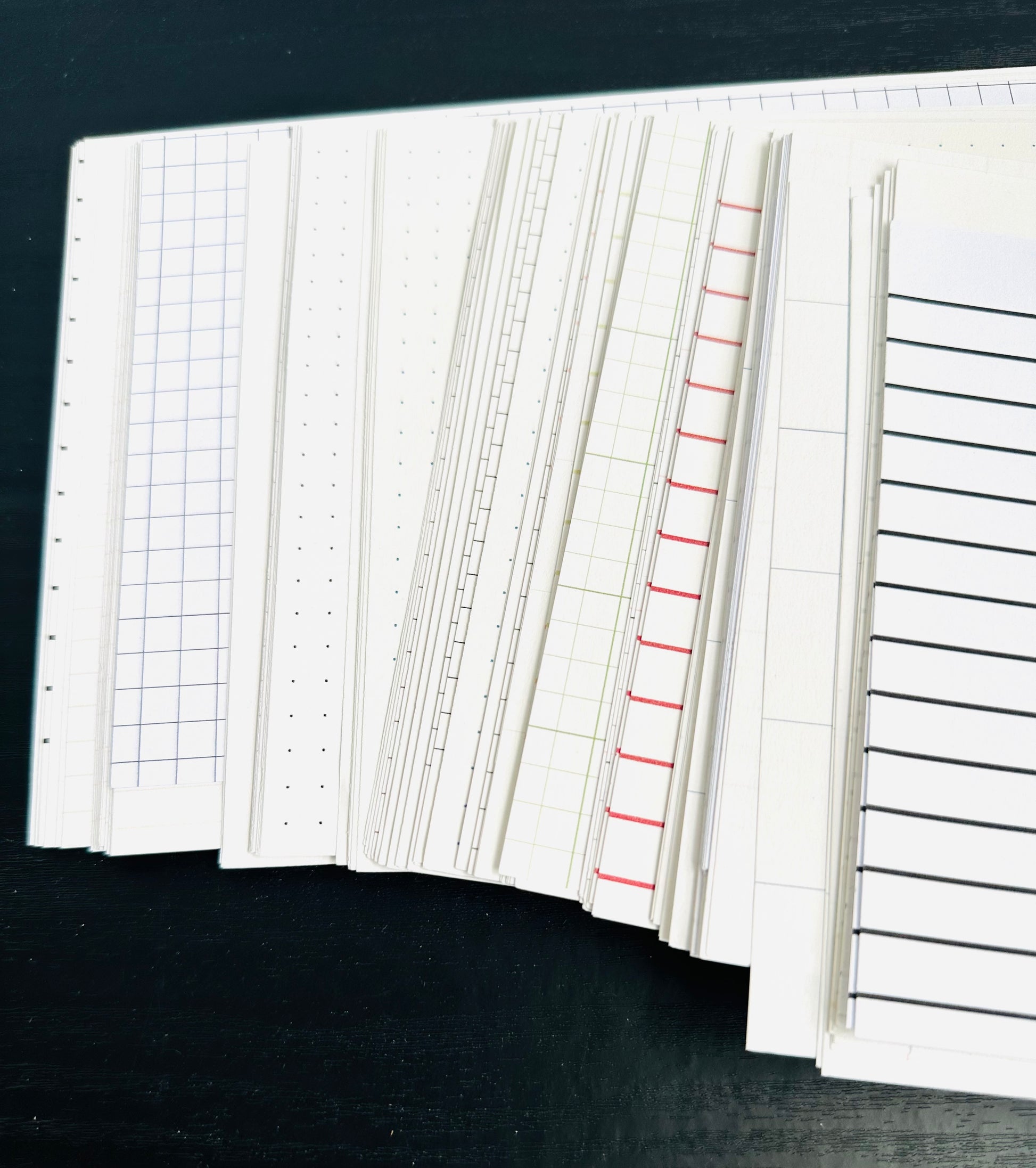 This pack features 70 lb. text & 60 lb. drawing paper and has approximately 150-200 sheets, approximately 8.5” x 6”. These are former sample sheets of my shop and feature lined, thick lined, dot and graph paper in a variety of colors.